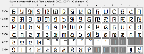 U+1E900..U+1E95F にアドラム文字が登録された。アルファベットは,大文字・小文字・ダイアクリティカルマーク・句読点からなる。フリーフォント Noto Sans Adlam
